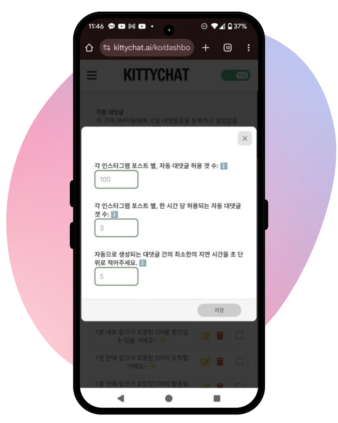 ▪️키티챗은 인스타그램의 위험 신호를 실시간으로 감지해 🚨 이를 사용자에게 알리고, 자동대댓글 간의 지연을 바로 600초로 늘려둡니다.