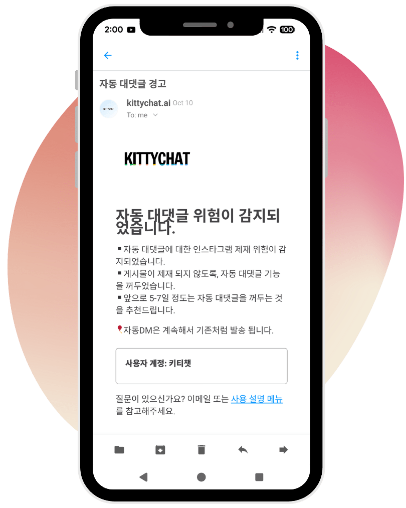 키티챗에서는 인스타그램 재제 위험을 사전 감지하고 이를 고객에게 이메일로 알려드립니다.